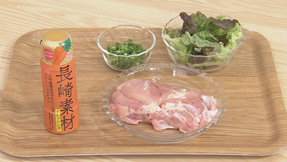 [1] 鶏肉は筋を取り半分に切って、塩こしょうをふります。ビニール袋に鶏肉とドレッシングを入れて、よくもみ込み、30分ほどおきます。