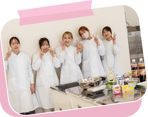 私たちは日頃、卒業時に「栄養士資格取得」を目標に毎週、調理実習を行いながら、栄養についての知識を身につけています。
