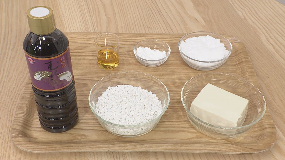 [1] ボウルに白玉粉を入れて、豆腐を少しずつ加え、耳たぶのやわらかさになるまでこねます。