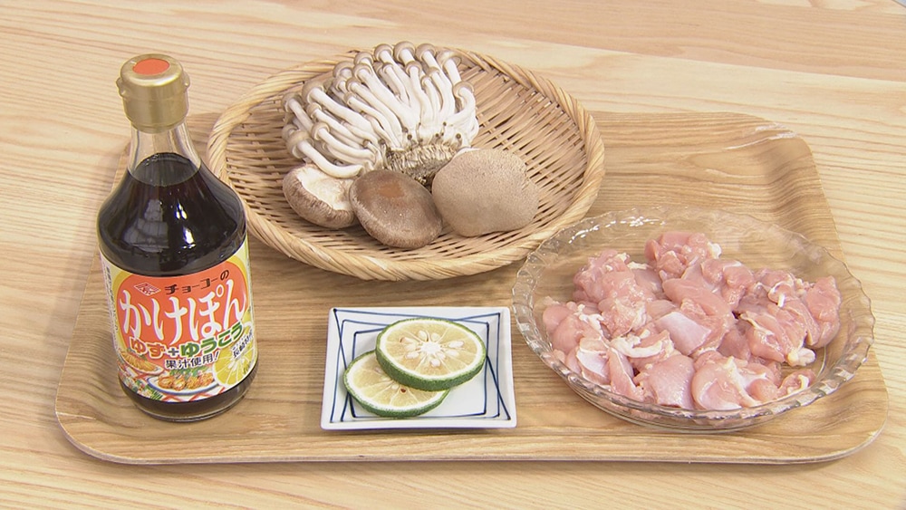 [1] 鶏肉は一口大に切って、しいたけは石づきを取り5mm幅に切ります。しめじは石づきを取って、小房に分けます。エリンギは縦に薄切りにします。